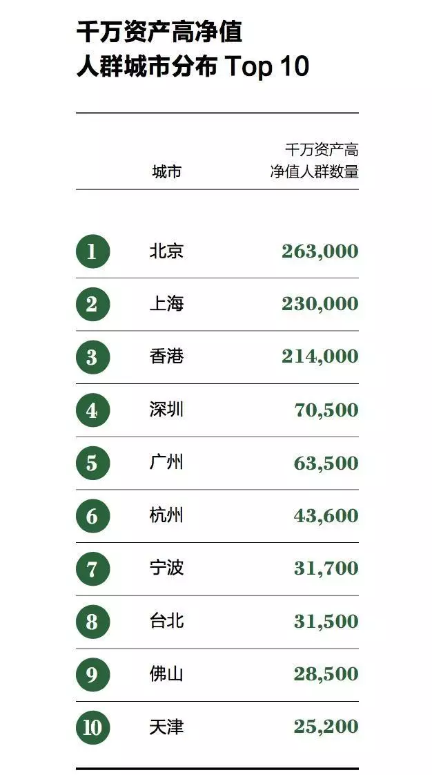 更加引人矚目的一組數據是:在香港,每600人中就有1人是億萬富豪;其次是臺北、北京和上海,每1200-1600人中有1人是億萬富豪。這么看來,有錢人真的是隨處可見啊。