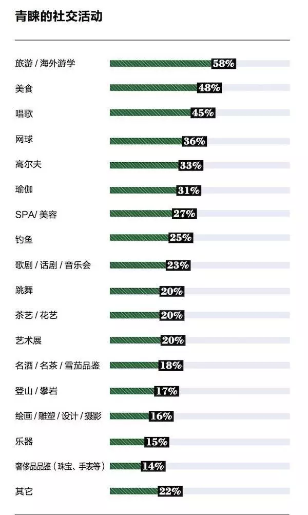 報告顯示,旅游以及海外游學成為富豪們最青睞的社交活動,占比58%,其次是美食、唱歌。