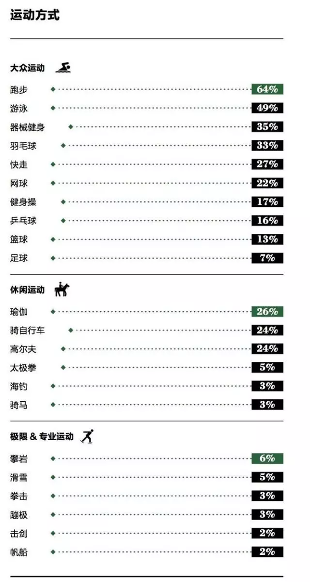 從運動方式來看,在“大眾運動”中跑步(64%)最受高凈值人士青睞,其次是游泳和器械健身,分別占49%、35%。這三項運動也是所有運動類型中排名前三的運動方式。高凈值人群最愛的前三項“休閑運動”是瑜伽、騎自行車以及高爾夫球;而攀巖、滑雪成為他們最喜愛的“極限&專業運動”。