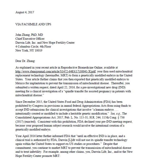 美國(guó)食品及藥物管理局在信中透露,2016年4月,在使用線粒體移植法,幫助一位患有嚴(yán)重線粒體疾病的中東女性在墨西哥產(chǎn)下世界首位“三親嬰兒”后,張進(jìn)向FDA提交了書(shū)面請(qǐng)求,希望進(jìn)行新藥臨床試驗(yàn)申請(qǐng)前咨詢(Pre-IND Meeting, PIND),以便開(kāi)展圍繞“用線粒體移植法進(jìn)行線粒體疾病患者輔助生育”的臨床試驗(yàn)。在為患者提供該技術(shù)前,張進(jìn)需要通過(guò)臨床試驗(yàn),證明技術(shù)的有效性、安全性。