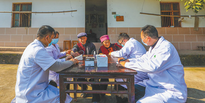 在重慶市墊江縣裴興鎮拱橋村,鎮衛生院家庭簽約醫生上門給村民檢查身體。