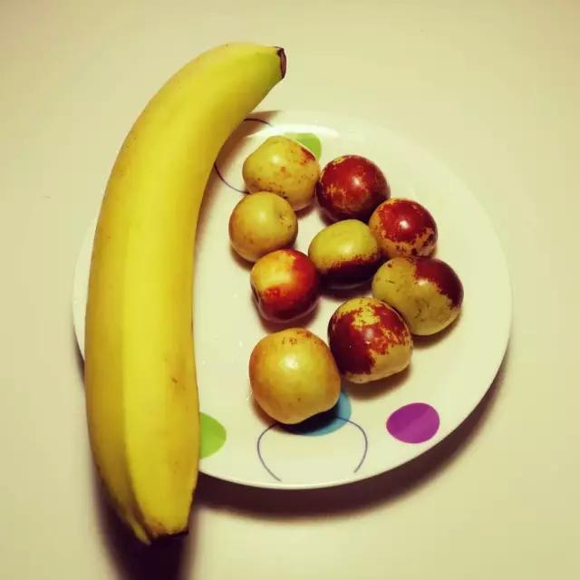 2、取還沒熟透、吃著有點硬澀的黃色香蕉一根,紅綠相間的脆冬棗一把,先吃一口香蕉,再吃一個棗,充分咀嚼混合;