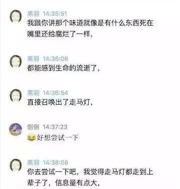 起初看到有人說“蘸了肥皂水的蒼蠅味”時,我在心里已經(jīng)把他嘲笑了八百遍,世界上怎么會有人知道蘸了肥皂水的蒼蠅是什么味簡直是傻!然而在我嚼了七口左右的那個瞬間,我的心靈深處突然傳來一個聲音告訴我這就是蘸了肥皂水的蒼蠅味,這就是剛放了個屁的放屁蟲味!