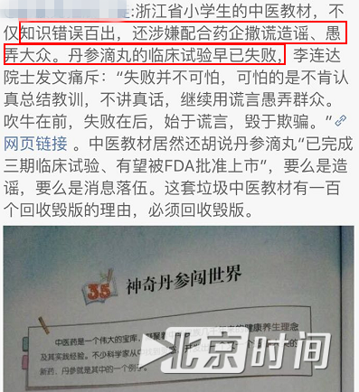 9月14日,微博網(wǎng)友披露浙江省小學(xué)生的中醫(yī)教材《中醫(yī)藥與健康》中“不僅存在知識(shí)錯(cuò)誤百出,還涉嫌配合藥企撒謊造謠、愚弄大眾”,引起廣泛關(guān)注。