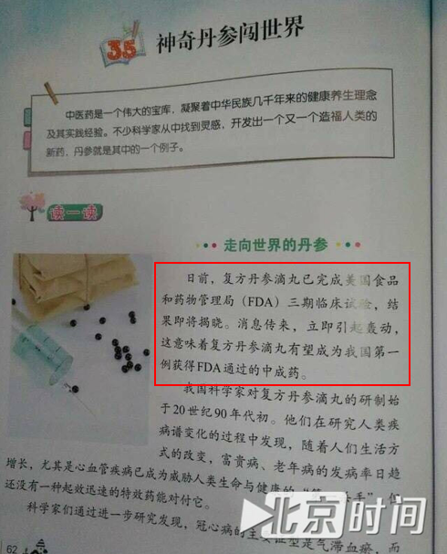 網(wǎng)友對(duì)教材中關(guān)于復(fù)方丹參滴丸的內(nèi)容提出質(zhì)疑。有網(wǎng)友稱,在8月30日剛剛完成的三期試驗(yàn)結(jié)果并不理想,同時(shí),中國(guó)工程院院士、中藥藥理學(xué)專家李連達(dá)也發(fā)文稱,“丹參滴丸三期臨床慘遭失敗”、“藥物無(wú)效”。