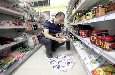 ▲ 5月9日,沙坪壩大學城某超市,鹽業部門執法人員查獲“腳臭鹽”。 本報記者雷鍵攝