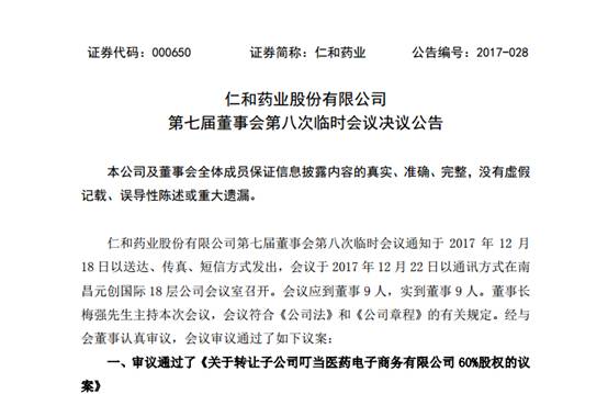 12月22日晚,仁和藥業(yè)股份有限公司發(fā)布“第七屆董事會第八次臨時會議決議公告”,公司擬以6,636萬元將公司持有的60%股份轉(zhuǎn)讓給原股東,此次股權(quán)轉(zhuǎn)讓完成后,公司不再持有叮當醫(yī)藥電子商務有限公司的股權(quán)。