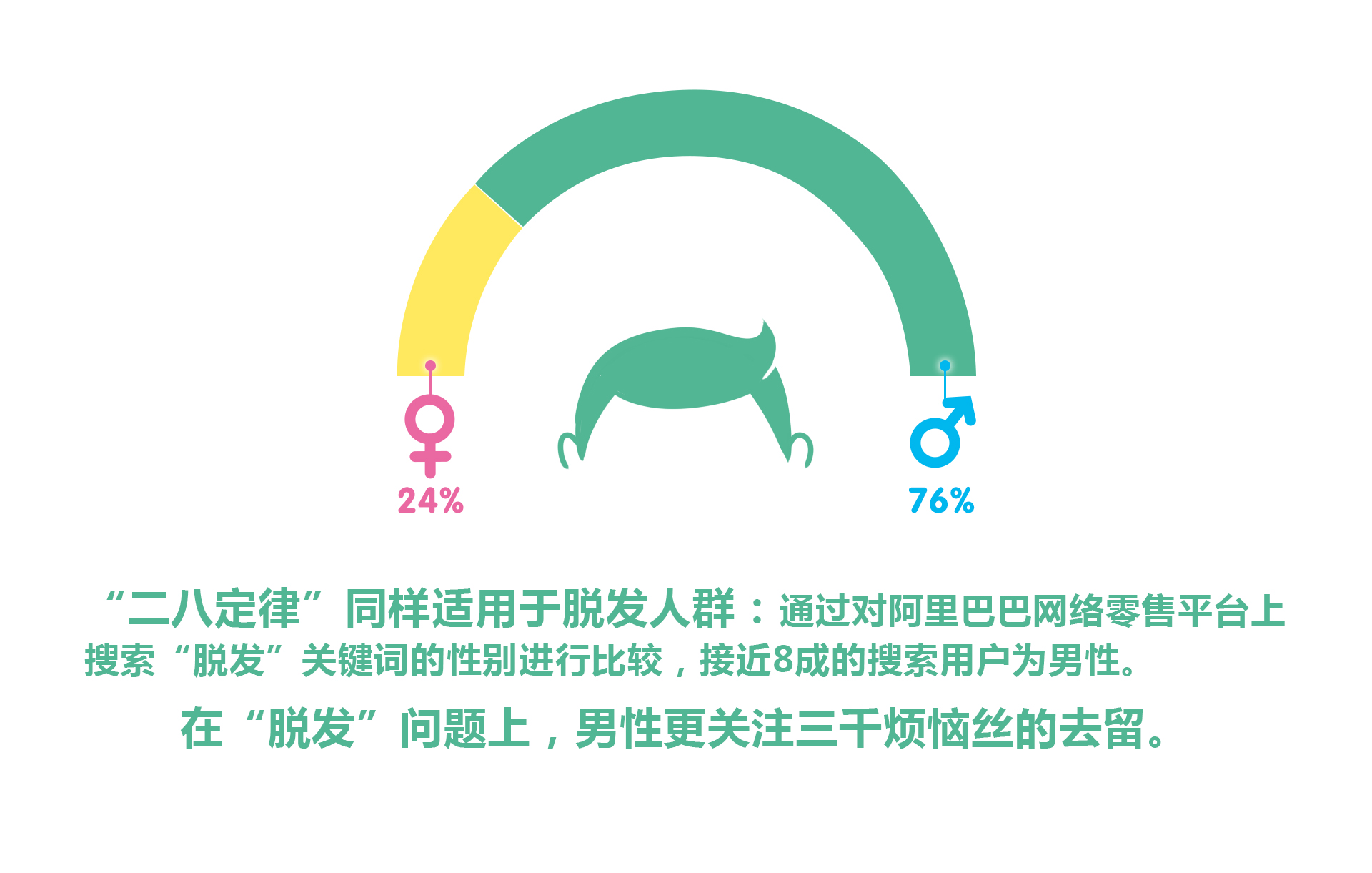 此前有官方數(shù)據(jù)統(tǒng)計(jì)稱:每5位中國成年男性中即有1人脫發(fā),而女性脫發(fā)率僅為1/20,而“脫發(fā)”搜索數(shù)據(jù)的性別占比與前者基本吻合——原來脫發(fā)這件事也存在“二八定律”。