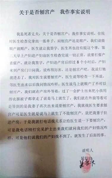 而一份網上流傳的顯示為榆林墜樓孕婦丈夫延壯壯所發名為“關于是否剖宮產 我作事實說明 ”的聲明中也反復聲明,自己幾次要求剖宮產,但醫生就說等等。聲明全文如下: