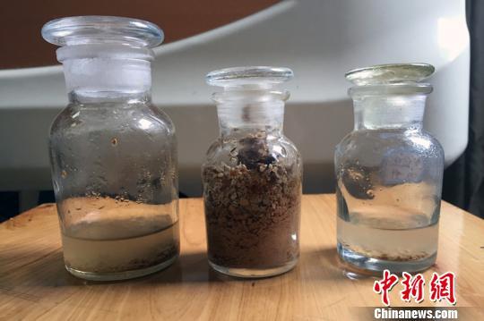 從鄒先生右腎內取出的結石幾乎裝滿其中一只玻璃瓶。陳松 攝
