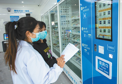 浙江省金華經濟技術開發區蘇孟鄉和悅社區衛生服務智慧健康驛站,居民在醫生指導下通過自助藥柜取藥。