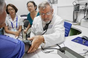 圖片來(lái)源:新京報(bào)據(jù)介紹,培訓(xùn)采取現(xiàn)場(chǎng)面對(duì)面教學(xué)的方式,重點(diǎn)培養(yǎng)全科醫(yī)療基本技能、醫(yī)患溝通技巧、帶教方法、管理能力、科研能力5大核心能力,并將組織學(xué)員到國(guó)外優(yōu)秀全科醫(yī)學(xué)教學(xué)基地考察。培訓(xùn)結(jié)束前,將通過(guò)筆試和標(biāo)準(zhǔn)病人的實(shí)際診療能力等方式對(duì)學(xué)員進(jìn)行考試,考試題目都是美國(guó)醫(yī)師認(rèn)證題庫(kù)中的標(biāo)準(zhǔn)題目,學(xué)員通過(guò)考試就意味著具有與美國(guó)家庭醫(yī)生的同等水平,成績(jī)優(yōu)異的學(xué)員將有機(jī)會(huì)到美國(guó)進(jìn)行短期的進(jìn)修學(xué)習(xí)。圖為美國(guó)醫(yī)生正在問(wèn)診中國(guó)患者。