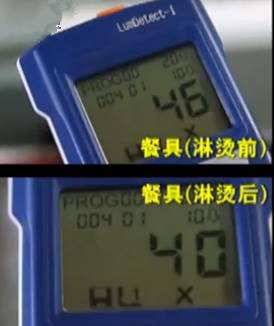 首先,用100℃開水對餐具進行淋燙,再對細菌數值(RLU,相對光單位)進行檢測。其次,測試儀結果顯示具表面細菌數值為40RLU。