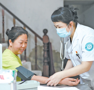 在浙江省臺州市椒江區洪家社區一名慢性病患者家里,社區衛生服務中心蔡海紅醫生正在為患者開展上門隨訪服務。