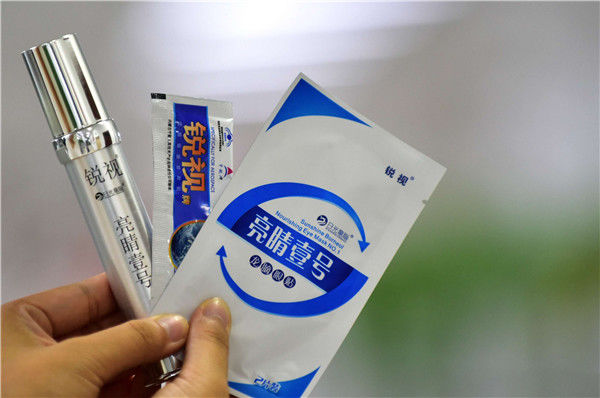 花了近萬元,黃婆婆買到360袋沖劑、36片貼片、6瓶噴霧,裝了滿滿一購物車。拖著車子回到家,她才有機會查看自己到底買了什么:3樣產品上均有“銳視”商標,產品名稱分別為“亮眼壹號龍腦眼貼”、“緩解視疲勞顆粒”和“亮眼壹號噴霧”。