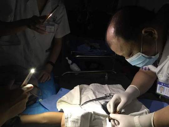 同樣中大五院急診科馮濤醫(yī)生為患者縫合、清創(chuàng)時,突然停電,當時,身旁的同事和家屬急中生智打開了手機照明,他沉著冷靜地繼續(xù)操作。