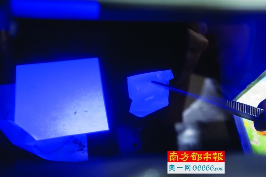 無紡布放在浸泡過紙巾樣品的萃取液中,取出后出現了熒光面積,說明紙巾中的熒光劑可遷移。 廣東出入境檢驗檢疫局檢驗檢疫技術中心輕工消費品安全實驗室工程師黎敏在接受鑒定君采訪。 此次測試的20款樣品