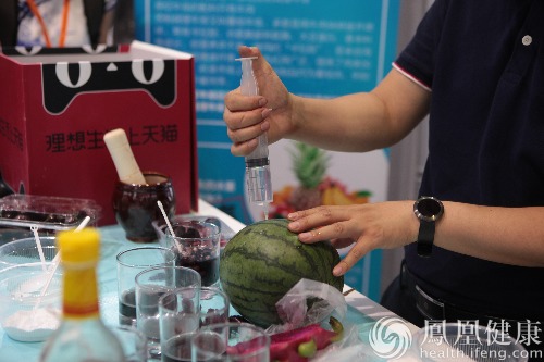 在食安周“科學實驗”展臺上,陳君石院士親自實驗,他拿著裝有楊梅汁、櫻桃,以及浸泡過黑皮花生和紫米的杯子,分別往楊梅汁、櫻桃汁里面加入堿,原本鮮紅色的水變成了藍黑色,再往里加入白醋(醋精),水的顏色又變回了紅色;而分別往黑花生、紫米(紫色的糙米)的杯子里面加入堿,原本暗紅色的水也變成了藍黑色,再往里面加入白醋,水的顏色又變回了暗紅色——這個簡單的實驗過程,證明了“水果掉色”是花青素遇堿、遇酸后發生的變色反應,并非外“加”顏色。