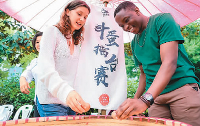圖為國外友人體驗半山立夏節民俗。