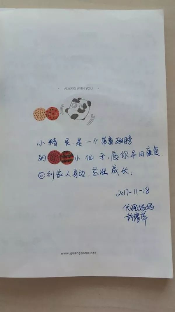 彭錫萍:小寶寶出院之后我就沒有寫了。出院那天我有些舍不得,但挺為他高興的,能把他交給他爸媽。出院的時候他媽媽就叫他爸爸抱,他爸爸還說說自己還沒抱過這么小的寶寶有些害怕。之后還跟他們說了挺多,挺感動的。小寶寶上午出院的,當天下午,感覺少了點什么。