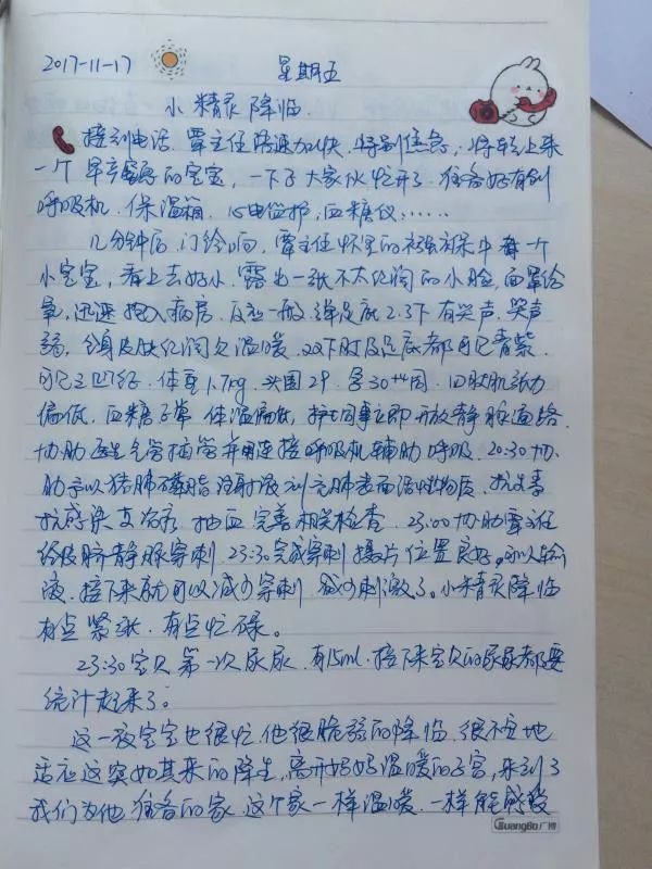 彭錫萍:小寶寶情況穩定的時候,我都會跟他講話,告訴他我要做什么操作。雖然他可能聽不懂,但是感覺會更有母愛。比如說“寶寶,要喝奶啦”,他喝完了奶就說“表現很棒啊”。給寶寶帶眼罩,我就會說“寶寶今天好酷啊”。一天都是我照顧他,所以我也比較清楚做了什么操作,寫日記的時候就通過回憶的方式記錄他一天的狀態。