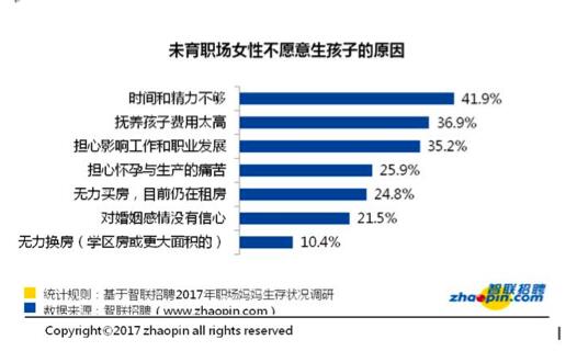 尚未生育的職場女性中暫時不想生育的女性占比為40.1%,不想生孩子的主要原因是時間精力不夠、撫養孩子費用較高、擔心影響工作和職業發展。