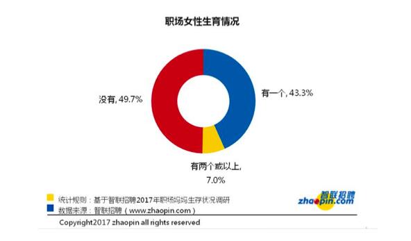 智聯招聘的調查數據顯示,在這次職場媽媽調查中,已生育兩個或以上孩子的受訪女性僅占7%,育有一個孩子女性為43.3%,近一半的女性暫未生育。
