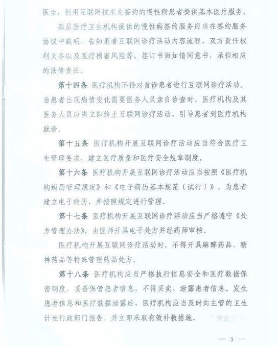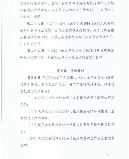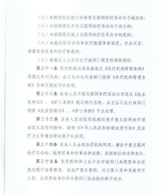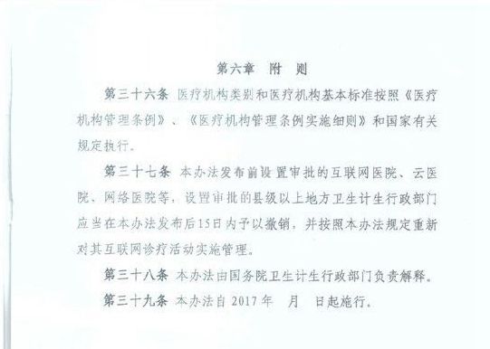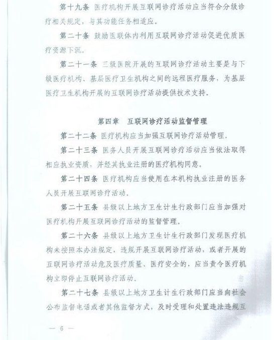 其中《辦法》一共有三十九條,分為“總則”、“互聯(lián)網(wǎng)治療活動準(zhǔn)入”、“互聯(lián)網(wǎng)診療活動執(zhí)業(yè)規(guī)則”、“互聯(lián)網(wǎng)診療活動監(jiān)督管理”、“法律責(zé)任”和“附則”共六章。