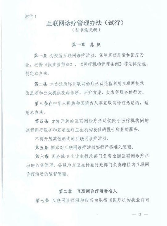 日前,國家衛(wèi)計委一份尚未公布的紅頭文件在坊間流傳,其中有關(guān)《互聯(lián)網(wǎng)診療管理辦法(試行)(征求意見稿)》(下稱《辦法》)的內(nèi)容,在互聯(lián)網(wǎng)醫(yī)療行業(yè)引起了軒然大波。文件明確了在其發(fā)布前設(shè)置審批的互聯(lián)網(wǎng)醫(yī)療的相關(guān)業(yè)務(wù)公司,應(yīng)當(dāng)在本《辦法》發(fā)布后15日內(nèi)予以撤銷,并按照本《辦法》規(guī)定重新對其互聯(lián)網(wǎng)診療活動實(shí)施管理。