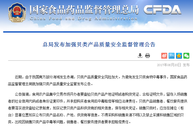 日前,由于部分南方海域發(fā)生赤潮。國家食藥監(jiān)總局曾發(fā)布慎食赤潮地區(qū)貝類海鮮的消費(fèi)提示。然而由于赤潮不斷,使用貝類風(fēng)險增加,近日,食藥監(jiān)總局再發(fā)貝類產(chǎn)品質(zhì)量安全監(jiān)督管理公告,要求各地區(qū)加強(qiáng)貝類產(chǎn)品監(jiān)督,同時提醒消費(fèi)者要增強(qiáng)自我保護(hù)意識,在購買貝類等水產(chǎn)品時,應(yīng)選擇大型、正規(guī)的超市或市場購買。