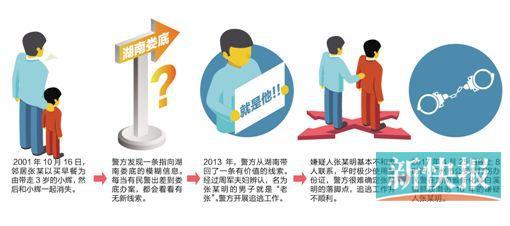 終于,在今年4月25日晚上8時許,廣州市公安局打拐辦民警根據(jù)可靠線索,在湖南省新化縣白溪鎮(zhèn)抓獲潛逃16年的嫌疑人張某明。