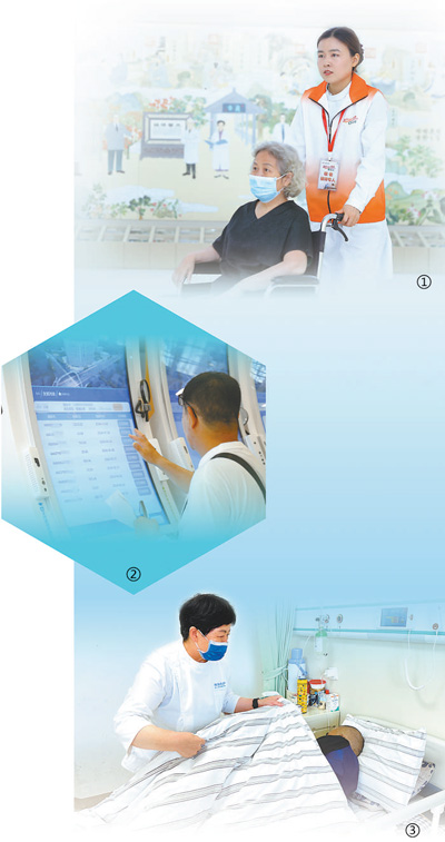 圖①:江蘇省中醫院為80歲以上老人提供就醫零等待服務。圖為敬老接待專人在送腿腳不便的老人就醫。