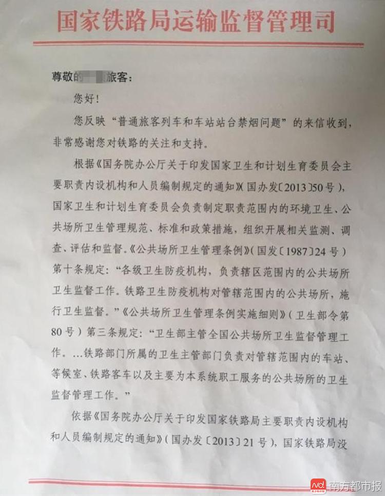 然而,國(guó)家鐵路局運(yùn)輸監(jiān)督管理司卻答復(fù)稱,根據(jù)國(guó)務(wù)院印發(fā)的國(guó)家鐵路局主要職責(zé)內(nèi)設(shè)機(jī)構(gòu)和人員編制規(guī)定,國(guó)家鐵路局沒(méi)有衛(wèi)生監(jiān)督管理相關(guān)職責(zé),關(guān)于李陽(yáng)反映的“普通旅客列車和車站站臺(tái)禁煙問(wèn)題”,建議向國(guó)家衛(wèi)生監(jiān)督管理部門(mén)反映,并引用了衛(wèi)計(jì)委的“三定方案”、《公共場(chǎng)所衛(wèi)生管理?xiàng)l例》等文件規(guī)定。
