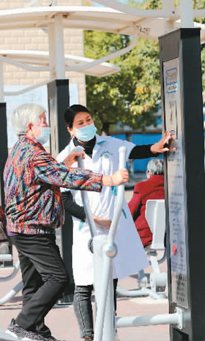圖為10月18日,山東省東營市東營區(qū)文匯街道勝安社區(qū)智能健身廣場,81歲的楊學(xué)英(左)跟醫(yī)護(hù)人員學(xué)習(xí)使用智能健身器材。