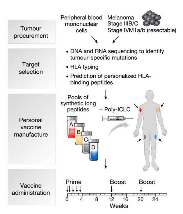 研究人員在對患者腫瘤細(xì)胞和正常細(xì)胞進(jìn)行深度測序的基礎(chǔ)上,找出腫瘤細(xì)胞中獨有的突變基因,將這些基因制成了最終的疫苗。