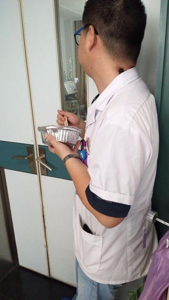 宋醫生一邊吃盒飯,一邊盯著病房里的患者。 都市快報圖