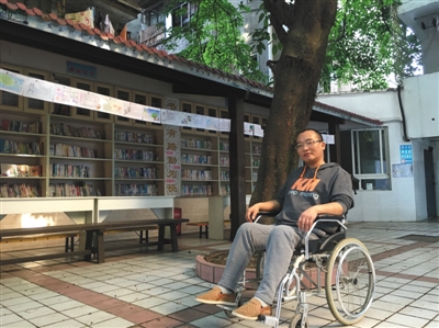 每節(jié)語文課前,班上力氣最大的兩位男生會(huì)來接他去教室,將輪椅放在簡易的木臺(tái)上,一位字跡工整的同學(xué)代他板書。