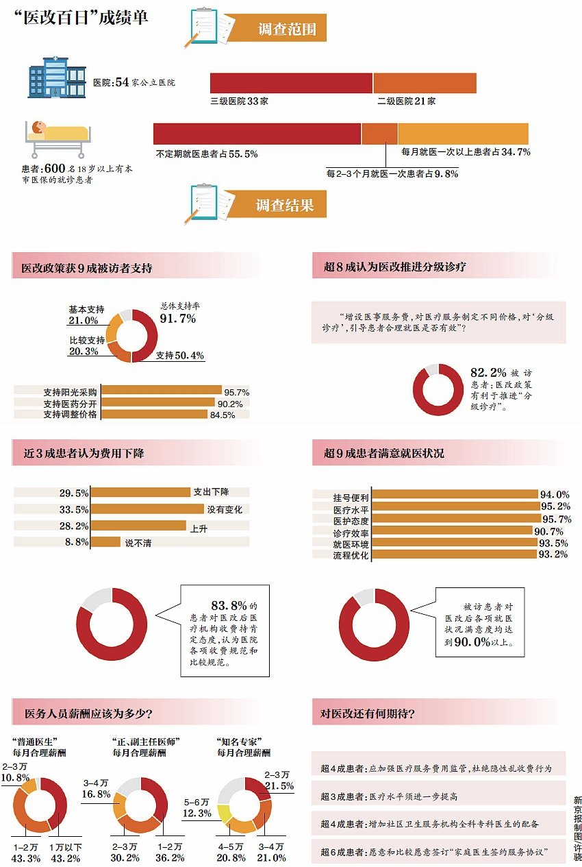 新京報訊(記者沙璐)北京醫(yī)改已過百日。新政策下患者看病難、看病貴問題是否得到緩解?就醫(yī)體驗如何?國家統(tǒng)計局北京調(diào)查總隊近期開展實施醫(yī)藥分開綜合改革效果民意調(diào)查,結(jié)果顯示,被訪患者對醫(yī)改政策支持率為91.7%,82.2%的被訪患者認(rèn)為,醫(yī)改政策有利于推進(jìn)“分級診療”。
