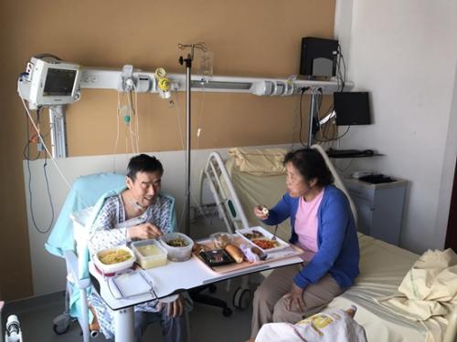 患者冮春鋒術后住院期間在病房用餐。(來源:法國《歐洲時報》記者張新攝)