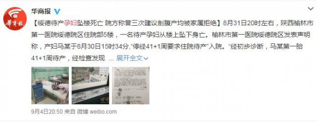 8 月31 日20 時左右,在陜西榆林市第一醫院綏德院區婦產科,一名孕婦從5 樓分娩中心墜下,因傷勢過重,經醫護人員搶救無效身亡。據媒體報道,榆林市第一醫院發表聲明稱是因為家屬多次拒絕實施剖腹產,最終導致產婦難忍疼痛、情緒失控跳樓。孕婦的丈夫延先生則否認了院方的說法,稱家屬曾先后兩次同意實施剖腹產,但醫院回說" 快要生了,不用剖腹產。"