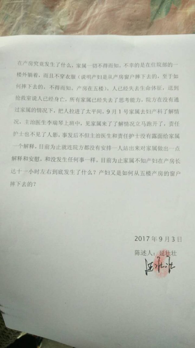 延先生堂哥:她第二次出來的時候確實跪下了,說疼得不行,我們都同意了(做剖腹產),我們也跟醫生說了,醫生說馬上要生了,不能做(剖腹產)了。