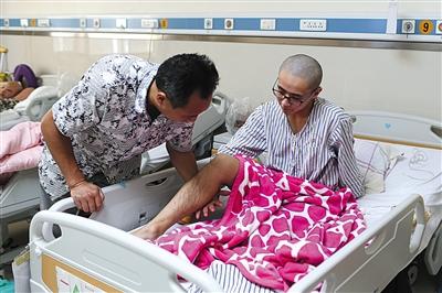 7月31日,在病房內,龔偉高考后因病截肢,手術后父親為龔偉的右腿按摩。 新京報記者王飛攝