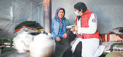 圖為日前,在青海省海東市民和回族土族自治縣官亭鎮喇家村安置點,山東援青醫生李鴻皓(右)為喇家村三社村民喬秀蘭講解用藥知識。