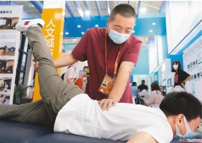 2021年9月3日,2021年中國(guó)國(guó)際服務(wù)貿(mào)易交易會(huì)上,參會(huì)者在文旅服務(wù)展館體驗(yàn)正骨技法。