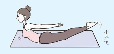 平臥在床上(床不要太軟),頭頸部后伸,雙上肢向背后伸直稍用力抬起,胸部離開床面,雙下肢伸直從床上抬起,以胸腹部為支撐點。