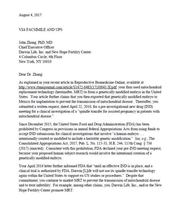美國食品及藥物管理局在信中透露,2016年4月,在使用線粒體移植法,幫助一位患有嚴重線粒體疾病的中東女性在墨西哥產下世界首位“三親嬰兒”后,張進向FDA提交了書面請求,希望進行新藥臨床試驗申請前咨詢(Pre-IND Meeting, PIND),以便開展圍繞“用線粒體移植法進行線粒體疾病患者輔助生育”的臨床試驗。在為患者提供該技術前,張進需要通過臨床試驗,證明技術的有效性、安全性。