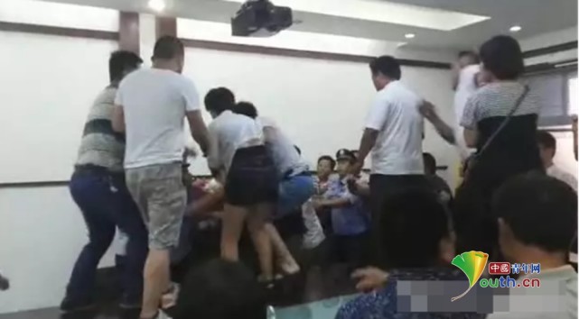 會議現(xiàn)場有人站在桌子上與院方調(diào)解人員發(fā)生沖突。