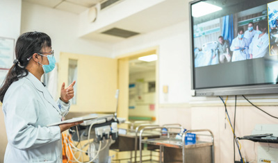 貴州省人民醫院呼吸科醫生通過“5G+”遠程醫療平臺對龍里縣人民醫院的患者給出治療建議。