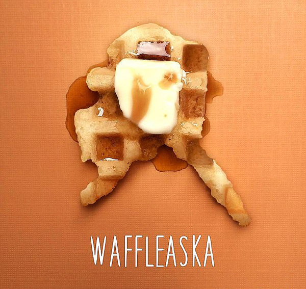 起初,8歲的卡梅隆向父親提議想要為美國各州制作美食地圖。但是克里斯認為這個創意太過時了,于是卡梅隆又想到可以根據不同的食材為各州重新命名,于是父子倆便攜手為看客們誠意獻上“美味的美利堅合眾國”這一大作。他們選用羽衣甘藍(Kale)創作加利福尼亞州地圖,于是“California”(加州)搖身一變成為了“Kalefornia”。父子倆每一副作品都像這樣,既讓人垂涎欲滴,又充滿智慧與靈感。