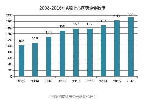 上市企業(yè)數(shù)量從另一個維度上可以看到行業(yè)的格局變化。2008-2016年,醫(yī)藥A股上市企業(yè)(按照招商證券分類,僅統(tǒng)計醫(yī)藥商業(yè)、中成藥、生物制藥與化學(xué)制藥數(shù)量)從102家增加至194家,至2017年6月16日為止,2017年再增13家藥企A股上市。從目前IPO的速度來看,2017年全國A股醫(yī)藥上市企業(yè)總數(shù)突破250家或是大概率事件,資本時代來臨,也進(jìn)一步意味著洗牌的加速。